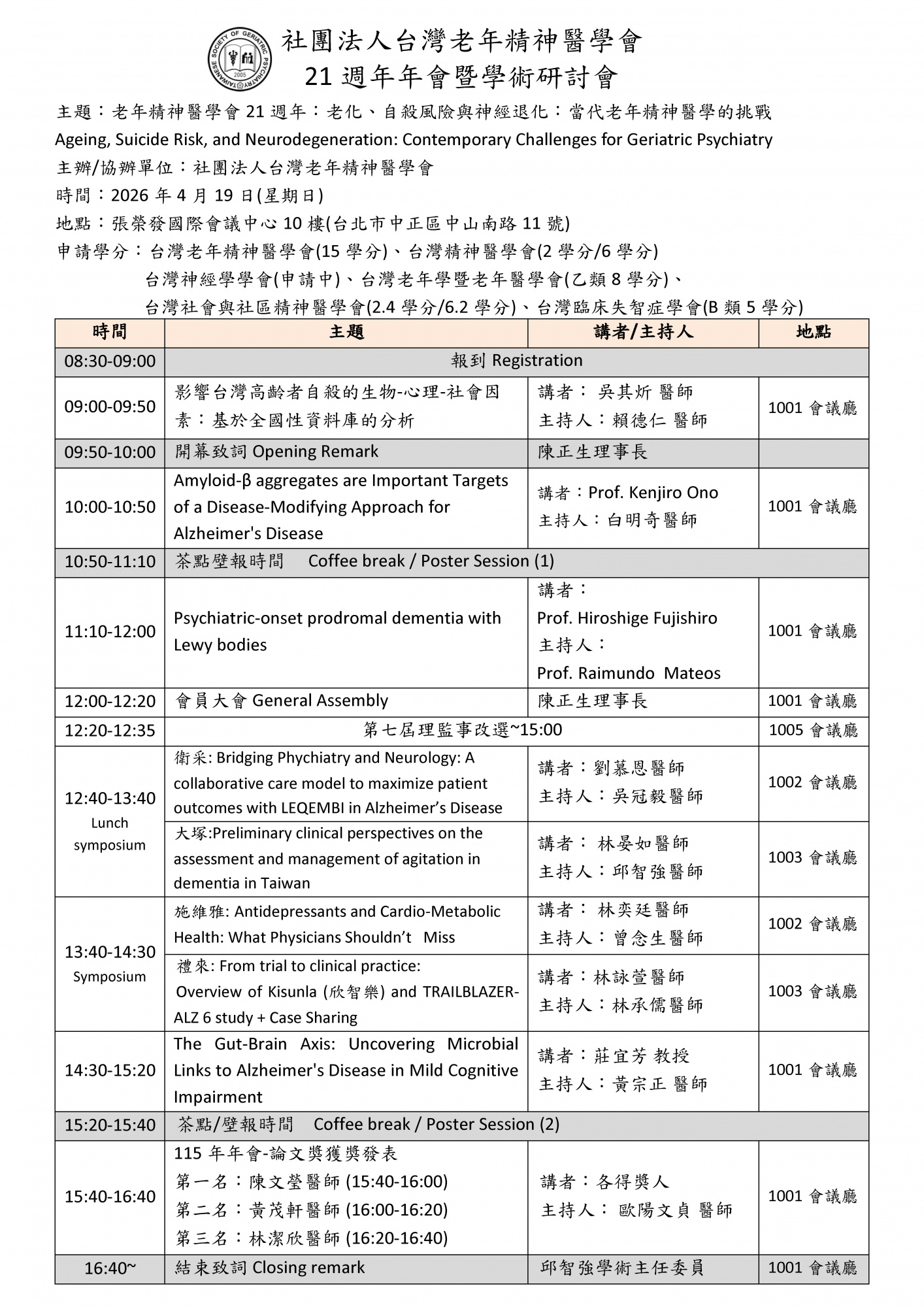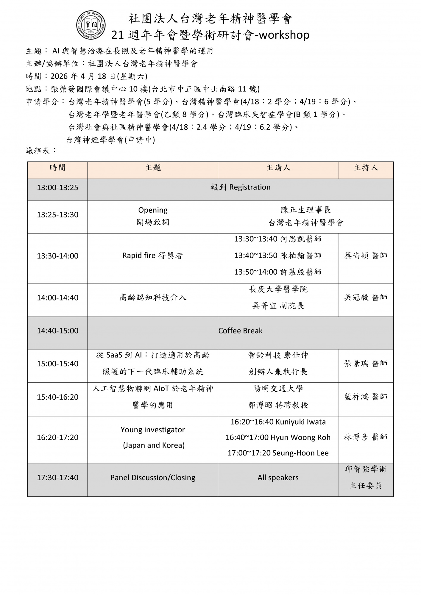 參與對象:台灣老年精神醫學會會員及對主題有興趣者